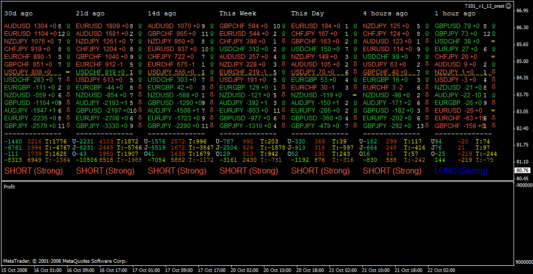 | Для начала. НЕ входить: 1. В шорт. Внизу правых столбцов все "шорт", при этом все красные вверху, все зеленые внизу. Даже если профит еще набегает, это из-за перетусовке цветных, каждых на своей половине. Символы уже выбрали свое "целенаправленное" движение, входить поздно, а удерживать еще можно, суммарный профит покажет. 2. В лонг. Внизу правых столбцов все "лонг", при этом все красные внизу, все зеленые вверху. Сто пудов - при этом в верхней и нижней строке окажутся во всех столбцах одни и те же символы - якоря. Что делаем? курим бамбук и ждем. Для нынешнего базара идеальна была ситуация 2 (общее, длительное направление рынка в шорт, лонги только как откаты). Ее развитие всегда было: Начиная с правого Н1 столбца символы трогаются навстечу друг другу - зеленые вниз, красные вверх, это "началось". Внизу начнут появляться шорты, и якоря пошли - открываем шорт 14. Может быть... Хотя... Но 1К брать можно  Добавлено (21.10.2008, 19:16) ---------------------------------------------